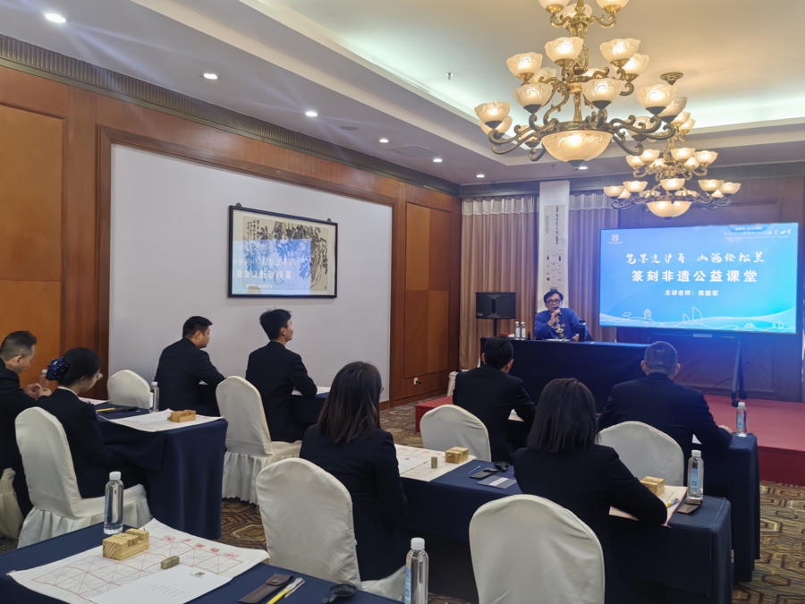 非遗文化体验,特邀中国书法家协会会员、沪尚墨缘顾问黄建军老师开设“篆刻非遗公益课堂”,向酒店年青员工传承金石艺术;