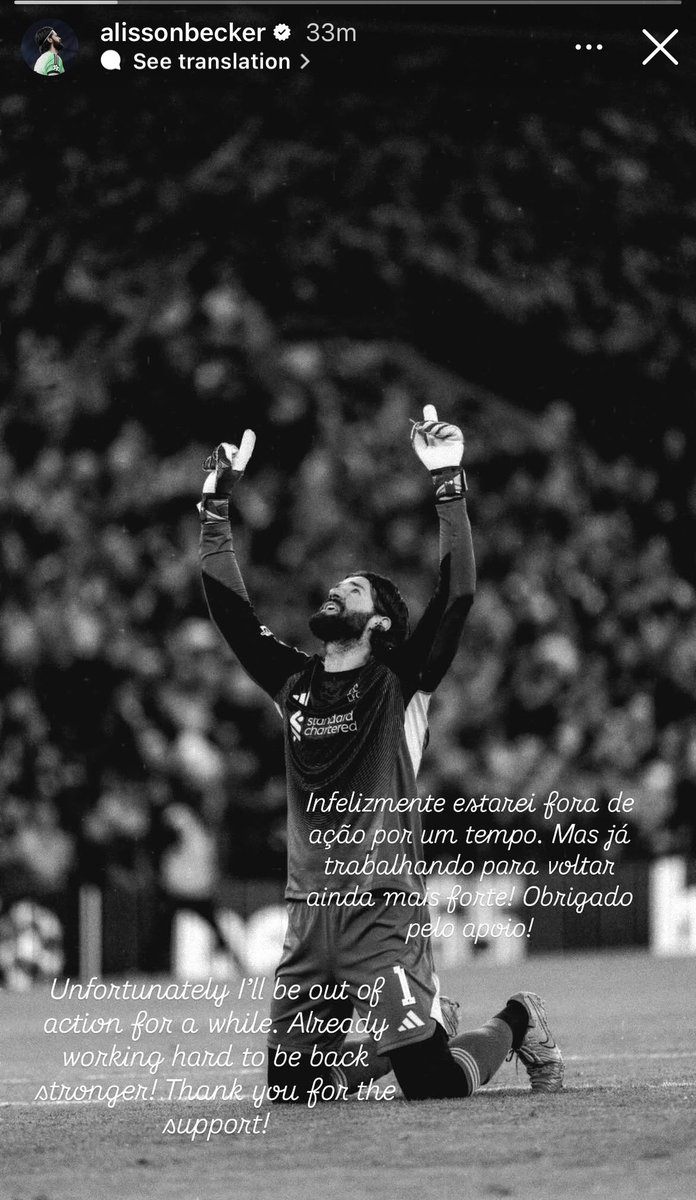 阿利松在个人社媒上发文写道:“很遗憾,我得暂时休息一段时间。已经在努力让自己更强大了。感谢您的支持。”