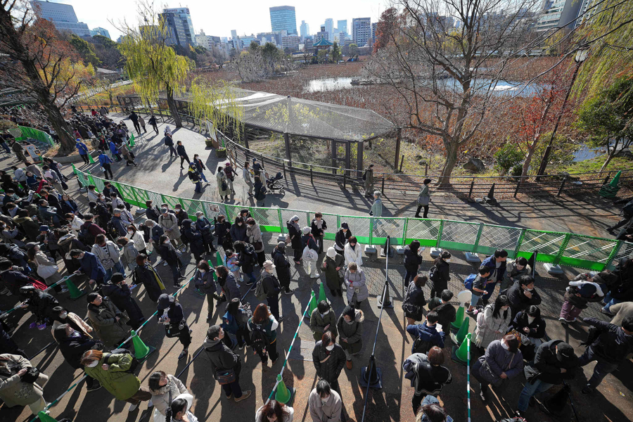 日本东京,上野动物园,游客排队参观大熊猫“晓晓”和“蕾蕾”。