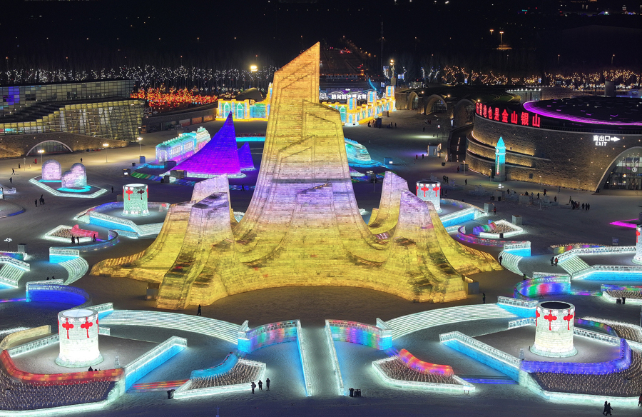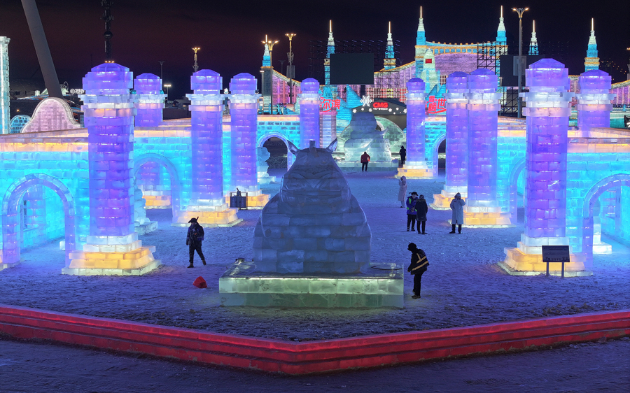 主塔“冰灯启梦”、翼展迎宾、主宾省/市景观群、童话王国、梦幻城堡、黄鹤楼、冰马逐梦等景观的细节打磨及亮化工程已全部完成。