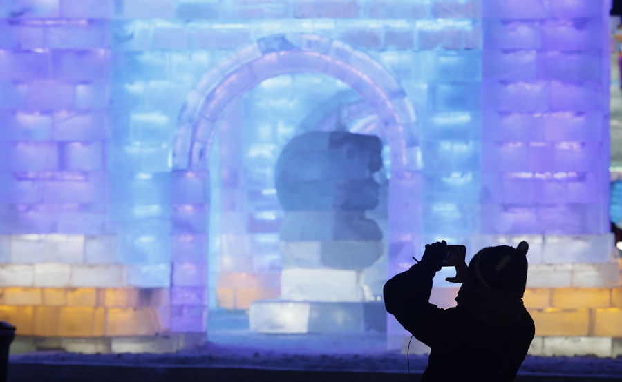 零下30℃的寒风中,冰雪王国在灯光下熠熠生辉。