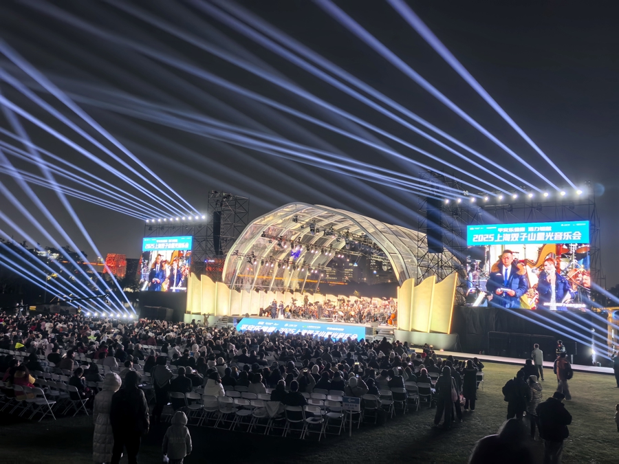 循着人潮抵达上海世博文化公园音乐之林,只见一个拱形的舞台拔地而起,透过舞台,还能看到架于中心湖之上的颇具传统韵味的十一孔桥与标志性的双子山。11月19日晚,由上海人民广播电台经典947与上海世博文化公园共同打造的首届“2025上海双子山星光音乐会”正式亮相。尽管天气寒冷,数千位观众如约而至,扶老携幼,坐在大草坪的白色椅子上,共赴一场深秋的户外古典音乐会。