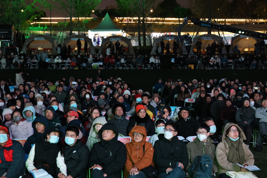 摒弃传统音乐厅的穹顶束缚,双子山音乐会以都市夜空为幕、山体绿意为景,构建起天然的沉浸式艺术空间。为抵御初冬的寒意,观众后区两侧设置了“暖心小屋”,给观众们提供免费的红糖姜茶和暖宝宝,让乐迷们在艺术的享受中,也能感受到贴心服务。